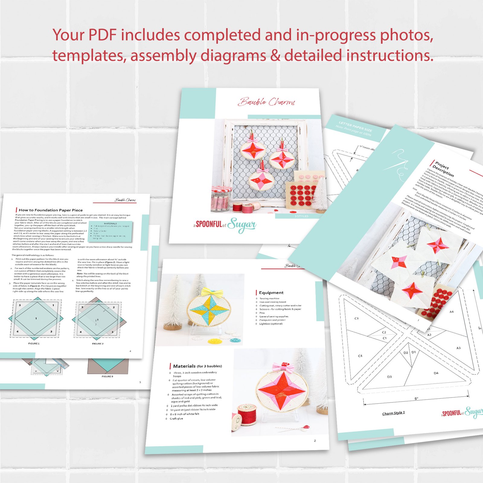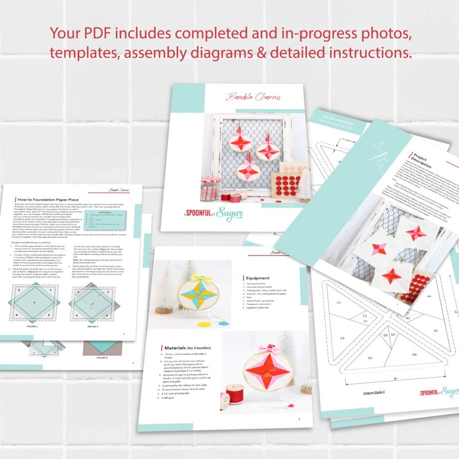 You will receive a 14-page ePattern in PDF format that includes comprehensive instructions, templates, and loads of photographs to guide you through the construction process of the Bauble Charms. PDF format allows you to print and reprint the instructions whenever you need. PDF allows you to zoom in on photos to see each step up close. Pattern is in English. Templates are included in both A4 and Letter Sized templates for your ease when printing at home. The bauble charms are foundation paper pieced. Pattern includes general instructions for foundation paper piecing.