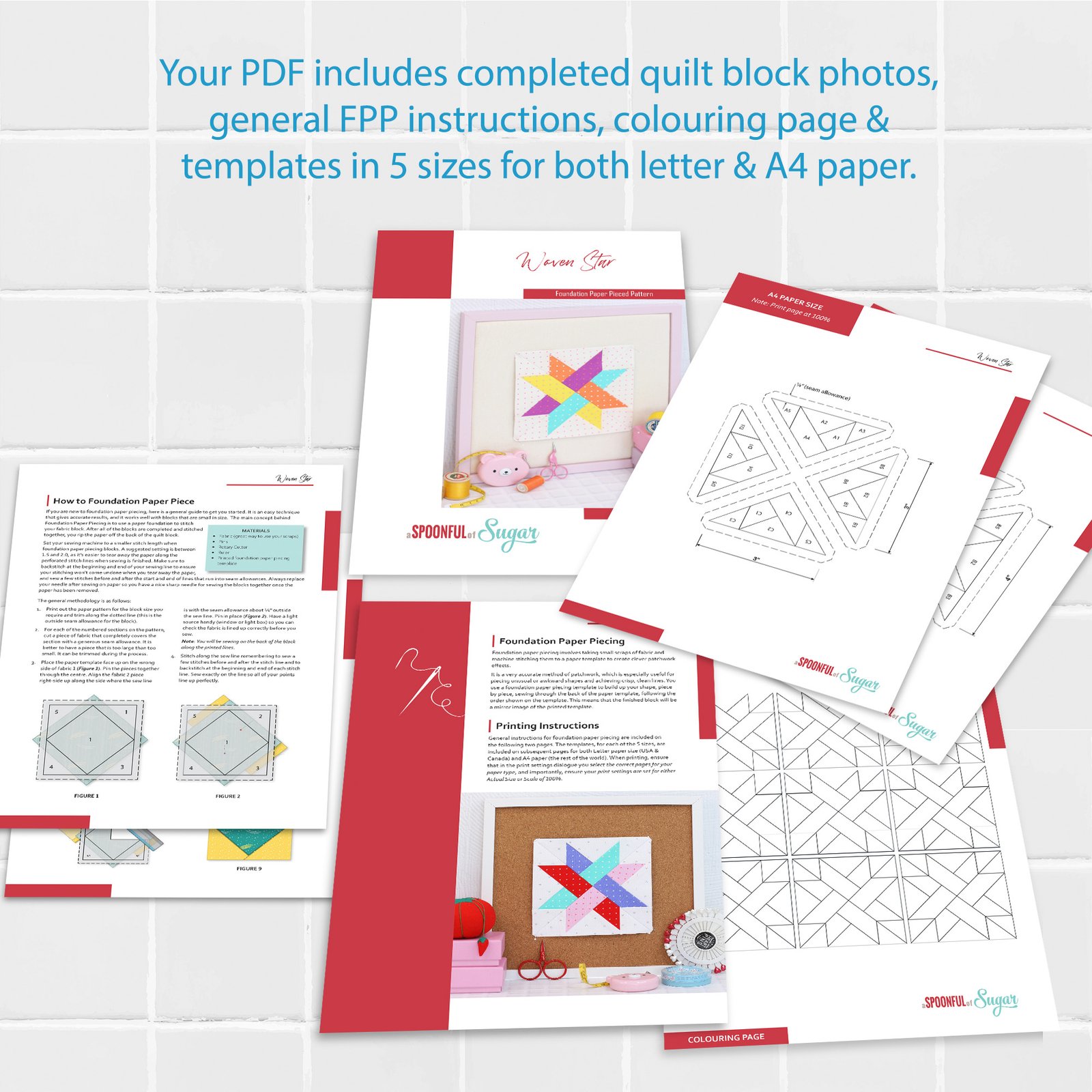 Please note this listing is for a PDF Pattern. You will receive a 18 page ePattern in PDF format that includes illustrated instructions on how to create a foundation paper pieced block, templates of each sized block (3 inch, 4 inch, 5 inch, 6 inch and 8 inch) and colouring sheet. PDF format allows you to print and reprint the blocks that you need for your project. Instructions are in English. Templates are included in both A4 and Letter Sized templates for your ease when printing at home.